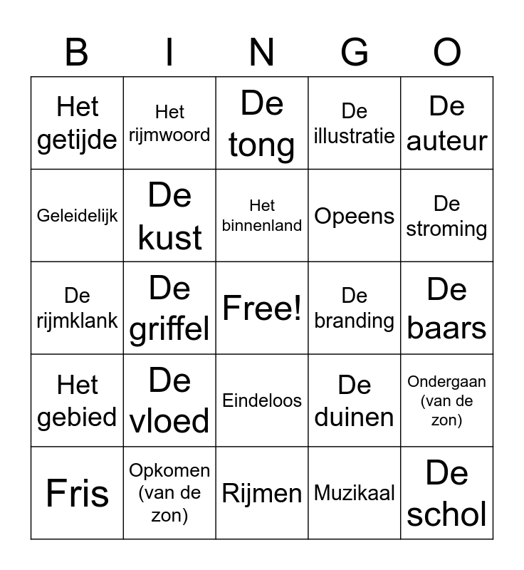 This bingo card has a free space and 36 words: Op pad gaan, Onderweg zijn, De bestemming bereiken, De kust, De duinen, Het gebied, Het binnenland, De duikbril, De auteur, De serie, De griffel, De illustratie, De golf, De branding, De stroming, Het getijde, De eb, De vloed, De schol, De tong, De baars, Ondergaan (van de zon), Opkomen (van de zon), Fris, Rijmen, Het rijmwoord, De rijmklank, Het gedicht, Opeens, Geleidelijk, De vos, De blubber, Muzikaal, Eindeloos, De tekst and De heimwee.