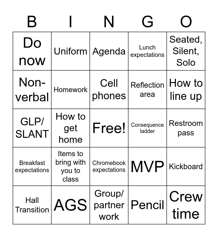 This bingo card has a free space and 24 words: Items to bring with you to class, AGS, Cell phones, Hall Transition, Seated, Silent, Solo, Do now, Non-verbal, Uniform, Consequence ladder, Chromebook expectations, Reflection area, GLP/ SLANT, MVP, Kickboard, Homework, Pencil, Restroom pass, Agenda, How to line up, How to get home, Crew time, Breakfast expectations, Lunch expectations and Group/ partner work.