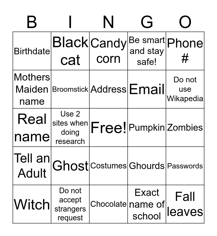 This bingo card has a free space and 24 words: Ghost, Do not accept strangers request, Address, Witch, Phone #, Birthdate, Mothers Maiden name, Black cat, Pumpkin, Costumes, Email, Real name, Ghourds, Passwords, Broomstick, Exact name of school, Zombies, Candy corn, Do not use Wikapedia, Use 2 sites when doing research, Fall leaves, Tell an Adult, Be smart and stay safe! and Chocolate.