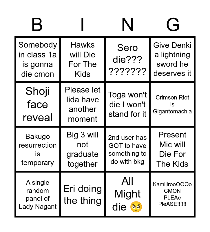This bingo card has 20 words: Present Mic will Die For The Kids, Shirakumo... ............ ............... ....., Sero die??? ???????, Denki please come back, A single random panel of Lady Nagant, Shoji face reveal, Eri doing the thing, Somebody in class 1a is gonna die cmon, Bakugo resurrection is temporary, Hawks will Die For The Kids, Big 3 will not graduate together, 2nd user has GOT to have something to do with bkg, Please let Iida have another moment, KamijirooOOOo CMON PLEAe PleASE!!!!!!, Toga won't die I won't stand for it, SHINSO RESSURECT SHIRAKUMO???, Crimson Riot is Gigantomachia, Give Denki a lightning sword he deserves it, All Might die 🥺 and Kirishima or Mina sacrifice???? ?????.
