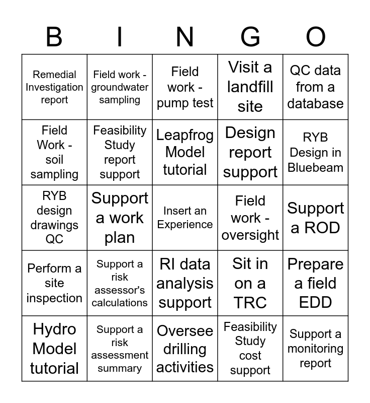 This bingo card has a free space and 24 words: Support a risk assessor's calculations, Support a risk assessment summary, Leapfrog Model tutorial, Hydro Model tutorial, QC data from a database, Remedial Investigation report, Field Work - soil sampling, Field work - groundwater sampling, Field work - oversight, RI data analysis support, Design report support, RYB design drawings QC, Sit in on a TRC, Prepare a field EDD, Feasibility Study report support, Feasibility Study cost support, Support a ROD, Field work - pump test, RYB Design in Bluebeam, Support a work plan, Support a monitoring report, Perform a site inspection, Visit a landfill site and Oversee drilling activities.