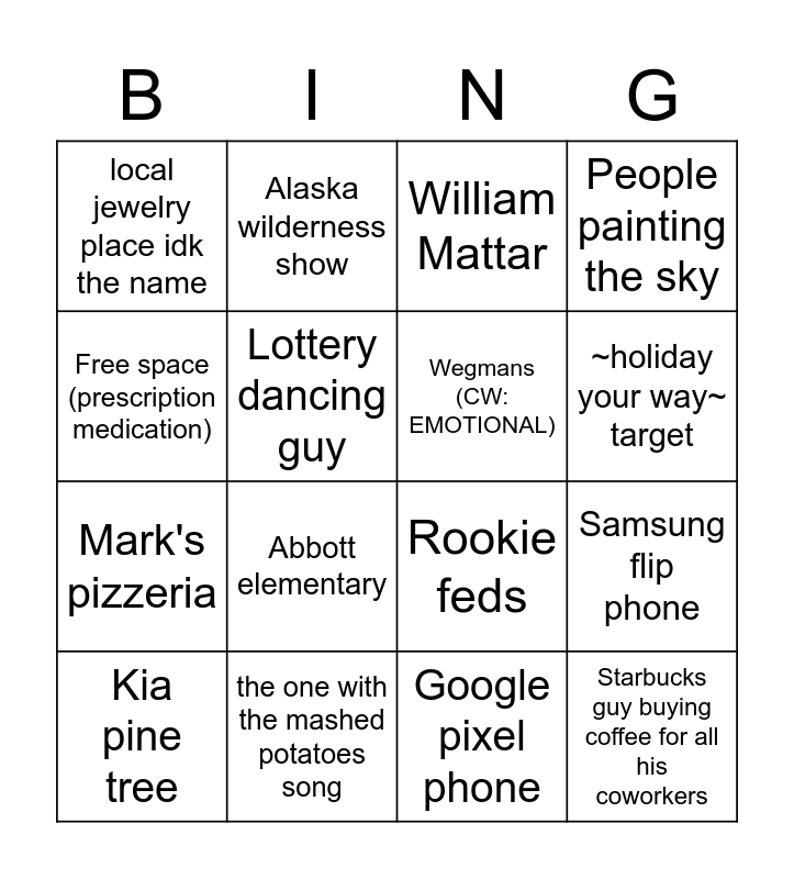 This bingo card has 16 words: the one with the mashed potatoes song, Samsung flip phone, William Mattar, local jewelry place idk the name, Mark's pizzeria, Alaska wilderness show, Rookie feds, Google pixel phone, Free space (prescription medication), Lottery dancing guy, Kia pine tree, People painting the sky, Abbott elementary, ~holiday your way~ target, Wegmans (CW: EMOTIONAL) and Starbucks guy buying coffee for all his coworkers.