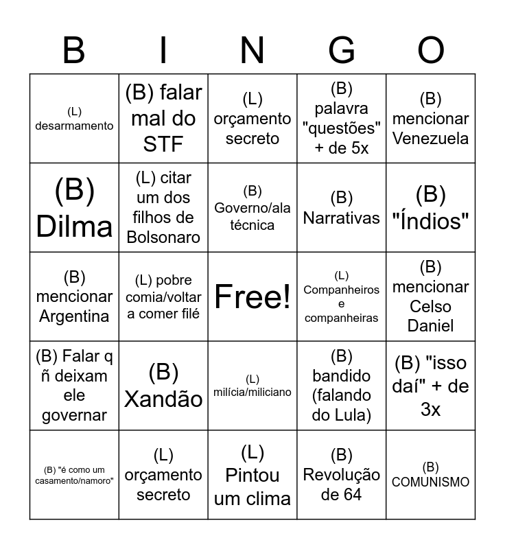This bingo card has a free space and 30 words: (L) orçamento secreto, (L) reverter/derrubar sigilos, (L) pobre comia/voltar a comer filé, (L) pobre em aeroporto, (L) desarmamento, (L) orçamento secreto, (L) citar um dos filhos de Bolsonaro, (L) milícia/miliciano, (L) Companheiros e companheiras, (L) Pintou um clima, (B) mencionar Celso Daniel, (B) COMUNISMO, (B) Revolução de 64, (B) Cloroquina, (B) "Índios", (B) Brilhante Ustra, (B) bandido (falando do Lula), (B) Falar q ñ deixam ele governar, (B) Xandão, (B) mencionar Venezuela, (B) mencionar Argentina, (B) questionar urnas, (B) falar mal do STF, (B) Narrativas, (B) Dilma, (B) palavra "questões" + de 5x, (B) "isso daí" + de 3x, (B) "é como um casamento/namoro", (B) Governo/ala técnica and (B) pedófilo.
