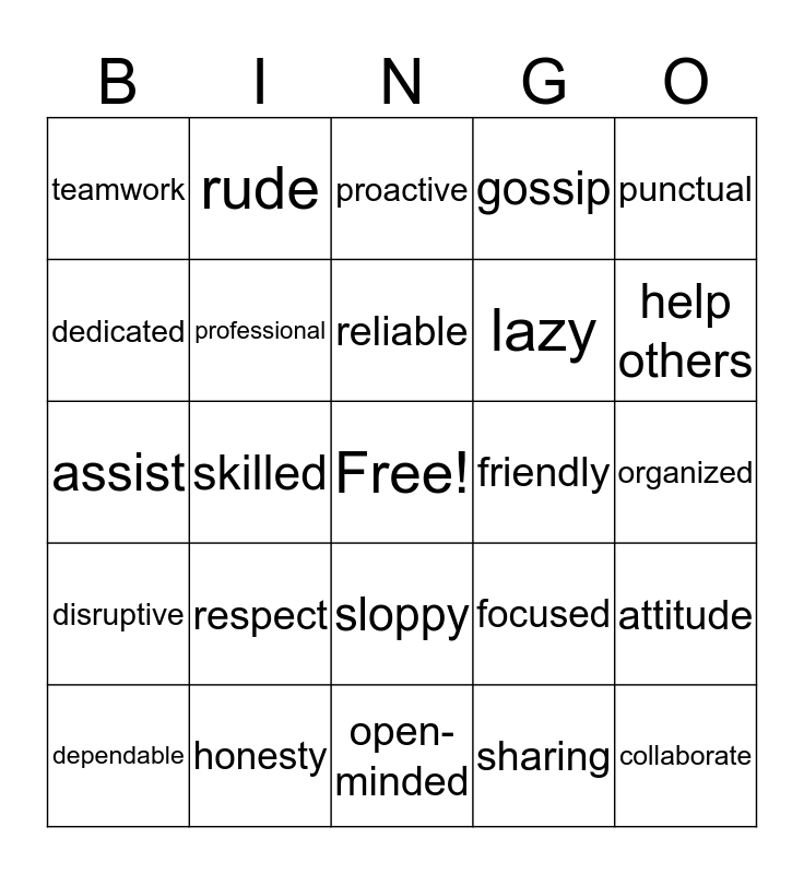 This bingo card has a free space and 24 words: respect, honesty, reliable, dependable, punctual, teamwork, dedicated, rude, friendly, sloppy, lazy, assist, focused, attitude, professional, sharing, organized, proactive, help others, skilled, collaborate, disruptive, gossip and open-minded.
