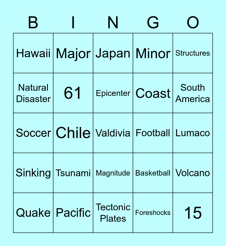 This bingo card has a free space and 29 words: Quake, Earthquake, Chile, Puerto Montt, Hawaii, Japan, 61, Tsunami, Football, Pacific, Lumaco, 15, Tectonic Plates, Foreshocks, South America, 9.5, Magnitude, Sinking, Structures, Soccer, Basketball, Bahamas, Coast, Natural Disaster, Minor, Major, Volcano, Epicenter and Waves.
