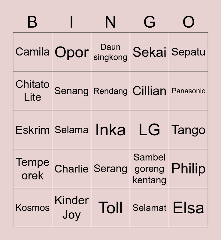 This bingo card has 25 words: Charlie, Toll, Rendang, Kosmos, Sepatu, Camila, Chitato Lite, Opor, LG, Serang, Cillian, Eskrim, Sambel goreng kentang, Philip, Senang, Elsa, Tango, Daun singkong, Panasonic, Selama, Inka, Kinder Joy, Tempe orek, Sekai and Selamat.