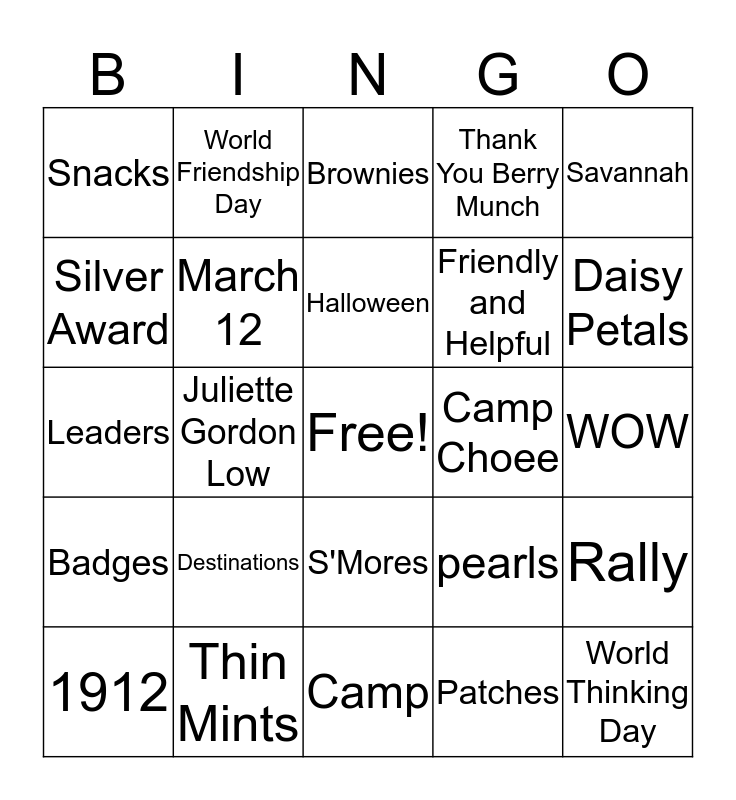 This bingo card has a free space and 24 words: Destinations, Thin Mints, Halloween, 1912, Savannah, Snacks, Silver Award, World Friendship Day, Camp Choee, S'Mores, Friendly and Helpful, Leaders, pearls, Rally, March 12, Patches, WOW, Brownies, Daisy Petals, Juliette Gordon Low, World Thinking Day, Badges, Thank You Berry Munch and Camp.