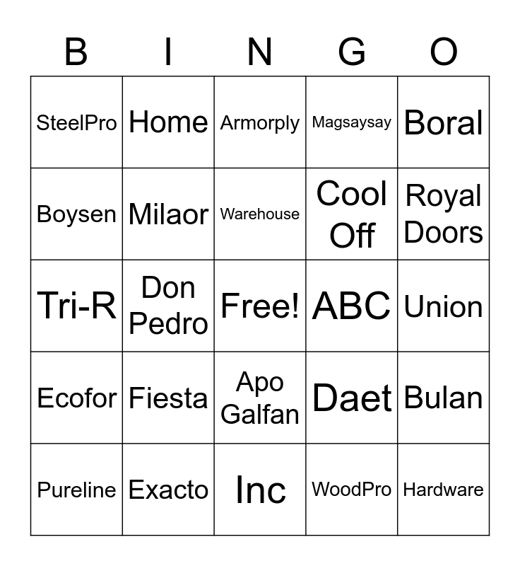 This bingo card has a free space and 48 words: Olivan, Hardware, Depot, Inc, Fiesta, Extra, Home, Davies, Boysen, Expert, Milaor, Magsaysay, Bulan, Daet, Primero, Hardieflex, Warehouse, ABC, APO, Boral, Don Pedro, WoodPro, SteelPro, Cool Off, Durasky, Royal Doors, Pureline, Regan, Apo Galfan, Ecofor, Matwood, DeltaWood, Jeamaxx, Jeaspan, Exacto, Exacto Plus, Mayon, Union, Santa Clara, IM Wood, Double Butterply, Hi-Tide, Armorply, Strux, Tri-R, Superior, Steel Asia and Silver +.