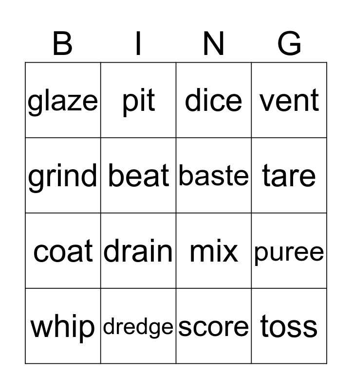 This bingo card has 16 words: dredge, puree, dice, glaze, coat, pit, mix, score, grind, beat, whip, vent, drain, tare, baste and toss.
