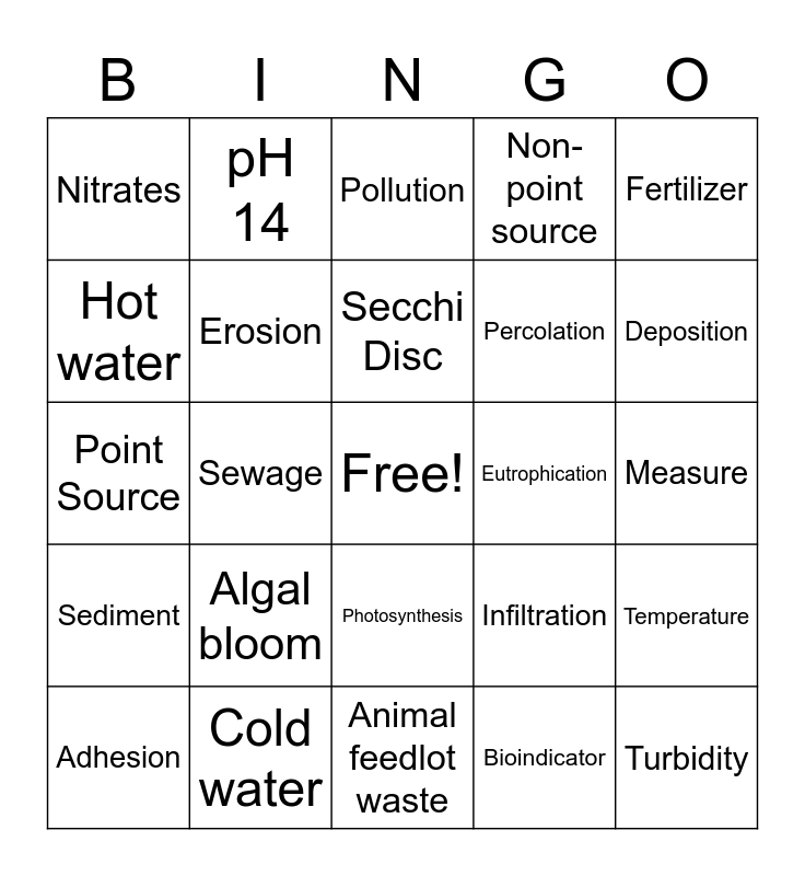 This bingo card has a free space and 33 words: pH, pH 0, Sewage, Reservoir, Sediment, Erosion, Fertilizer, Adhesion, pH 14, Macroinvertebrates, Secchi Disc, Pollution, Runoff, DO, Eutrophication, Deposition, Cold water, Point Source, Algal bloom, Infiltration, Photosynthesis, Aquatic, Nitrates, Measure, Animal feedlot waste, Turbidity, Non-point source, Percolation, Hot water, Temperature, Decomposition, Bioindicator and EPA.