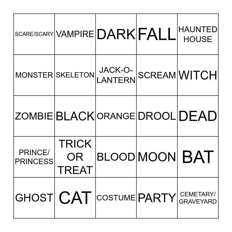 This bingo card has 25 words: TRICK OR TREAT, COSTUME, JACK-O-LANTERN, GHOST, HAUNTED HOUSE, SCARE/SCARY, MONSTER, VAMPIRE, DROOL, BLOOD, SCREAM, ZOMBIE, MOON, BAT, SKELETON, CEMETARY/ GRAVEYARD, DEAD, DARK, WITCH, BLACK, ORANGE, CAT, PRINCE/ PRINCESS, FALL and PARTY.