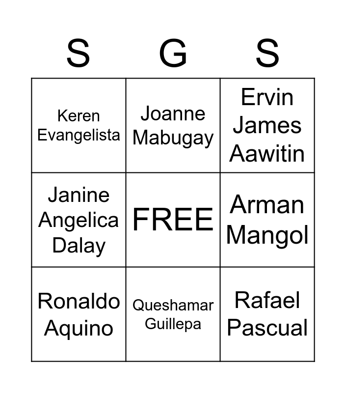 This bingo card has a free space and 16 words: Annalene Recaido, Jeffrey Magno, Ervin James Aawitin, Keren Evangelista, Erwin Praico, Joanne Mabugay, Marjorie Romualdez, Ruffy Laurio, Rafael Pascual, Arman Mangol, Sharon Dimaano, Janine Angelica Dalay, Luningning Garcia, Queshamar Guillepa, Ronaldo Aquino and Mann Joseph Cabor.
