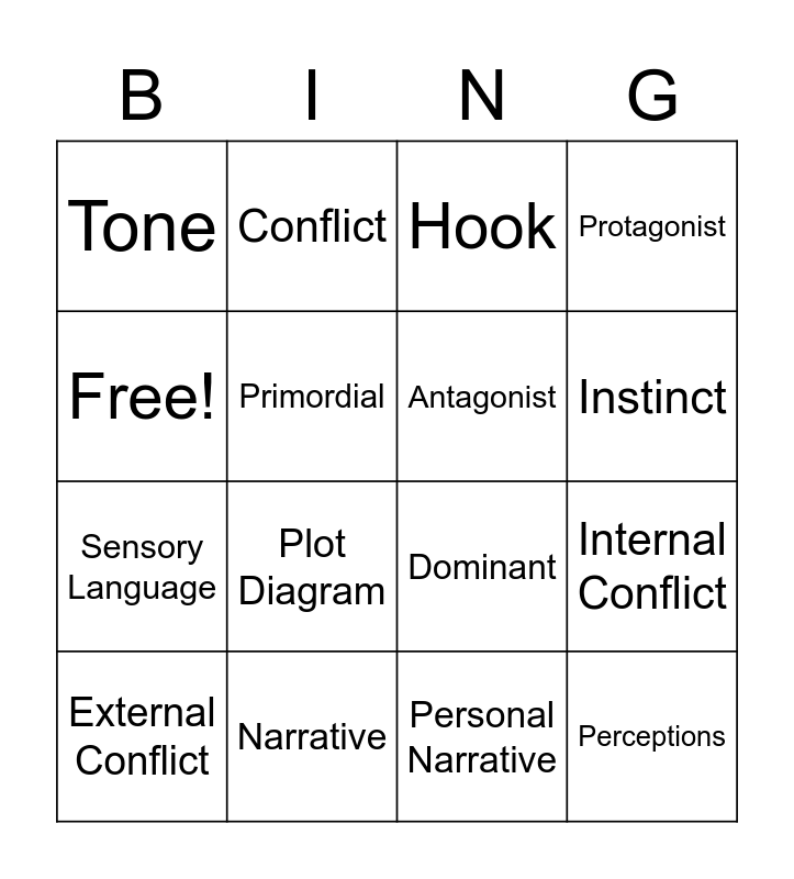 This bingo card has 16 words: Narrative, Internal Conflict, Hook, Tone, Sensory Language, Conflict, Dominant, Personal Narrative, Free!, Primordial, External Conflict, Protagonist, Plot Diagram, Instinct, Antagonist and Perceptions.