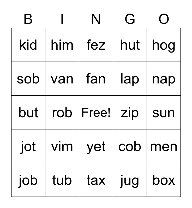 This bingo card has a free space and 24 words: vim, tub, fan, job, hog, kid, sob, him, zip, yet, lap, but, cob, men, van, jug, sun, fez, nap, rob, box, jot, hut and tax.