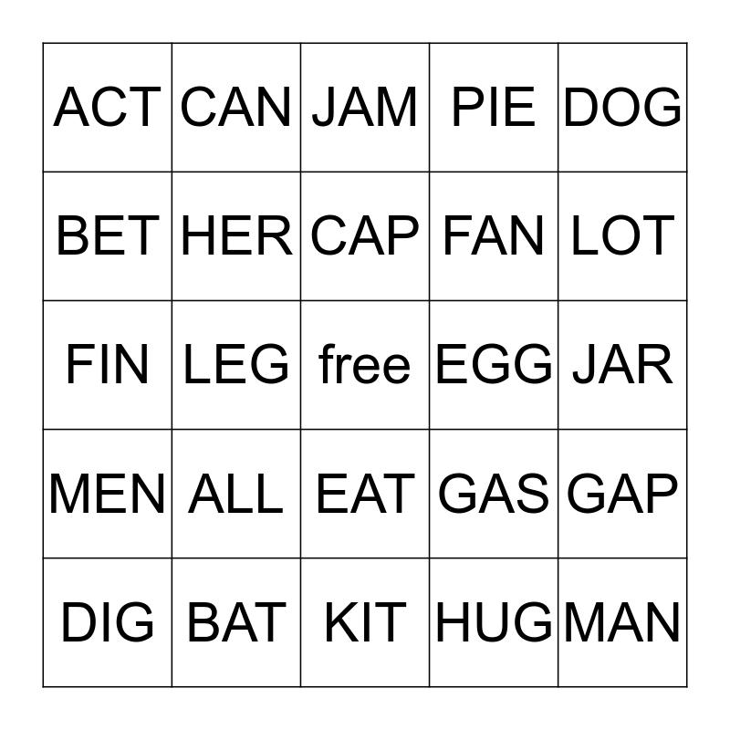 This bingo card has a free space and 24 words: ALL, BAT, CAP, DIG, DOG, ACT, BET, CAN, EGG, EAT, FAN, FIN, GAS, GAP, HER, HUG, JAR, JAM, LOT, LEG, MAN, MEN, PIE and KIT.