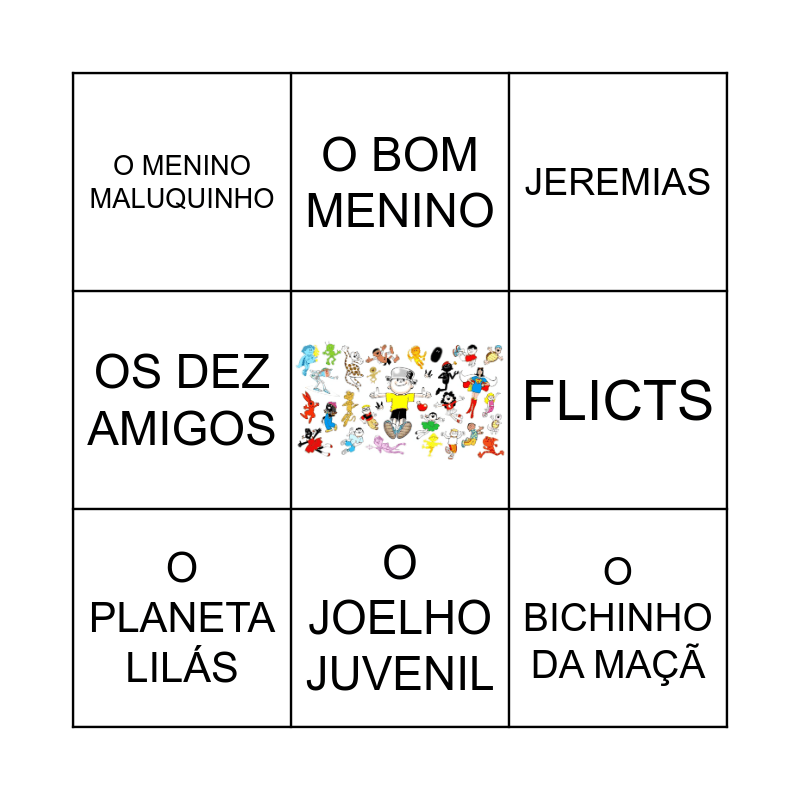 This bingo card has a free space and 8 words: FLICTS, JEREMIAS, O BOM MENINO, O PLANETA LILÁS, O MENINO MALUQUINHO, O BICHINHO DA MAÇÃ, OS DEZ AMIGOS and O JOELHO JUVENIL.