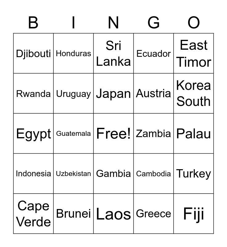 This bingo card has a free space and 196 words: Afghanistan, Albania, Algeria, Andorra, Angola, Antigua & Deps, Argentina, Armenia, Australia, Austria, Azerbaijan, Bahamas, Bahrain, Bangladesh, Barbados, Belarus, Belgium, Belize, Benin, Bhutan, Bolivia, Bosnia Herzegovina, Botswana, Brazil, Brunei, Bulgaria, Burkina, Burundi, Cambodia, Cameroon, Canada, Cape Verde, Central African Rep, Chad, Chile, China, Colombia, Comoros, Congo, Congo {Democratic Rep}, Costa Rica, Croatia, Cuba, Cyprus, Czech Republic, Denmark, Djibouti, Dominica, Dominican Republic, East Timor, Ecuador, Egypt, El Salvador, Equatorial Guinea, Eritrea, Estonia, Ethiopia, Fiji, Finland, France, Gabon, Gambia, Georgia, Germany, Ghana, Greece, Grenada, Guatemala, Guinea, Guinea-Bissau, Guyana, Haiti, Honduras, Hungary, Iceland, India, Indonesia, Iran, Iraq, Ireland {Republic}, Israel, Italy, Ivory Coast, Jamaica, Japan, Jordan, Kazakhstan, Kenya, Kiribati, Korea North, Korea South, Kosovo, Kuwait, Kyrgyzstan, Laos, Latvia, Lebanon, Lesotho, Liberia, Libya, Liechtenstein, Lithuania, Luxembourg, Macedonia, Madagascar, Malawi, Malaysia, Maldives, Mali, Malta, Marshall Islands, Mauritania, Mauritius, Mexico, Micronesia, Moldova, Monaco, Mongolia, Montenegro, Morocco, Mozambique, Myanmar, {Burma}, Namibia, Nauru, Nepal, Netherlands, New Zealand, Nicaragua, Niger, Nigeria, Norway, Oman, Pakistan, Palau, Panama, Papua New Guinea, Paraguay, Peru, Philippines, Poland, Portugal, Qatar, Romania, Russian Federation, Rwanda, St Kitts & Nevis, St Lucia, Saint Vincent & the Grenadines, Samoa, San Marino, Sao Tome & Principe, Saudi Arabia, Senegal, Serbia, Seychelles, Sierra Leone, Singapore, Slovakia, Slovenia, Solomon Islands, Somalia, South Africa, South Sudan, Spain, Sri Lanka, Sudan, Suriname, Swaziland, Sweden, Switzerland, Syria, Taiwan, Tajikistan, Tanzania, Thailand, Togo, Tonga, Trinidad & Tobago, Tunisia, Turkey, Turkmenistan, Tuvalu, Uganda, Ukraine, United Arab Emirates, United Kingdom, United States, Uruguay, Uzbekistan, Vanuatu, Vatican City, Venezuela, Vietnam, Yemen, Zambia and Zimbabwe.