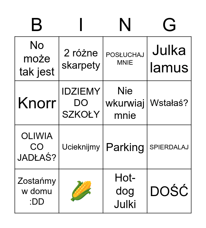 This bingo card has 16 words: 🌽, SPIERDALAJ, POSŁUCHAJ MNIE, No może tak jest, OLIWIA CO JADŁAŚ?, 2 różne skarpety, Parking, Hot-dog Julki, Knorr, IDZIEMY DO SZKOŁY, Zostańmy w domu :DD, Julka lamus, Ucieknijmy, Wstałaś?, Nie wkurwiaj mnie and DOŚĆ.