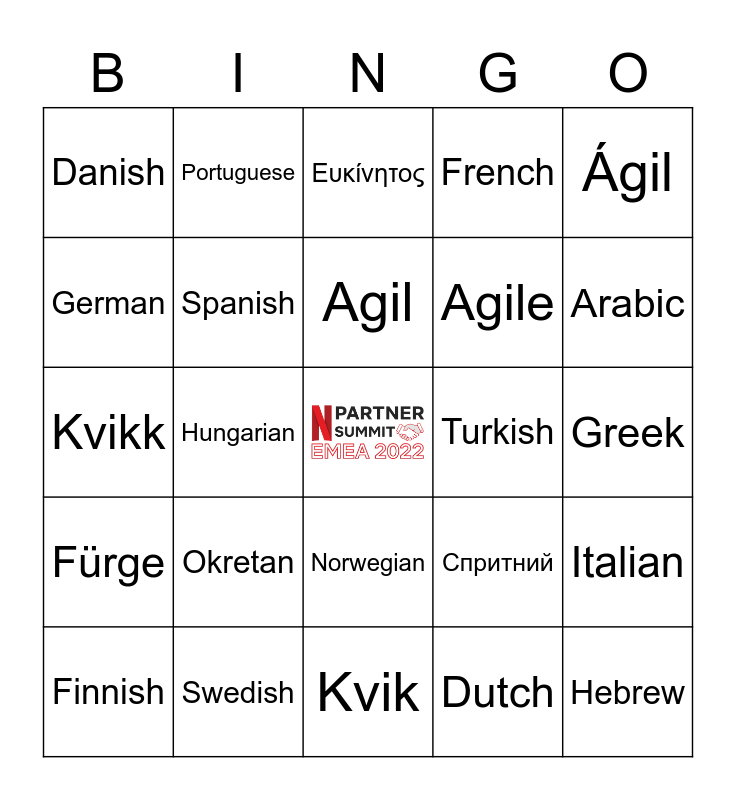 This bingo card has a free space and 38 words: Croatian, Romanian, Czech, Spanish, Italian, Okretan, Agil, Hbitý, Ágil, Agile, Hungarian, French, Hebrew, Greek, German, Fürge, זָרִיז, Ευκίνητος, Flink, Turkish, Danish, Swedish, Arabic, Finnish, Çevik, Kvik, Vig, رشيق, Ketterä, Polish, Ukrainian, Norwegian, Dutch, Portuguese, Zwinny, Спритний, Kvikk and Vlot.