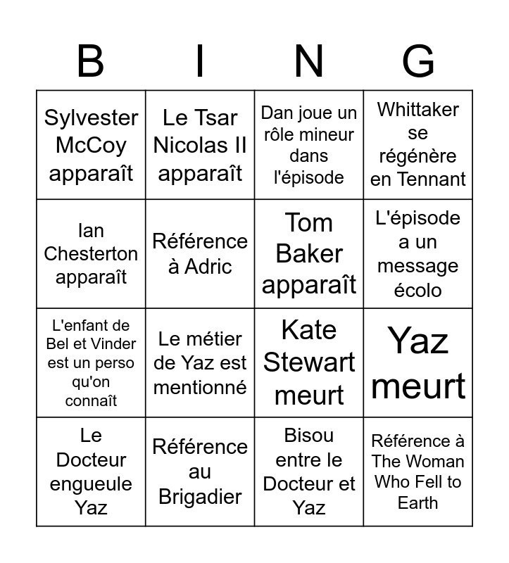 This bingo card has 16 words: Référence au Brigadier, Yaz meurt, Dan joue un rôle mineur dans l'épisode, Sylvester McCoy apparaît, L'enfant de Bel et Vinder est un perso qu'on connaît, Le Tsar Nicolas II apparaît, Kate Stewart meurt, Bisou entre le Docteur et Yaz, Ian Chesterton apparaît, Référence à Adric, Le Docteur engueule Yaz, Whittaker se régénère en Tennant, Le métier de Yaz est mentionné, L'épisode a un message écolo, Tom Baker apparaît and Référence à The Woman Who Fell to Earth.