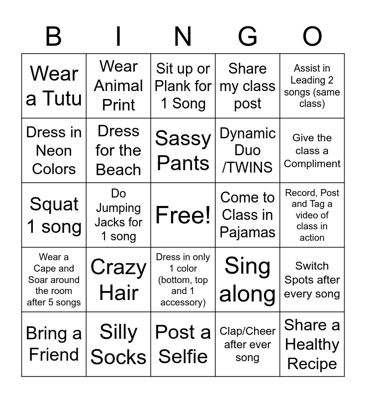 This bingo card has a free space and 24 words: Crazy Hair, Silly Socks, Sassy Pants, Bring a Friend, Assist in Leading 2 songs (same class), Wear a Tutu, Dress in Neon Colors, Wear Animal Print, Come to Class in Pajamas, Dress in only 1 color (bottom, top and 1 accessory), Dynamic Duo /TWINS, Squat 1 song, Sing along, Switch Spots after every song, Dress for the Beach, Clap/Cheer after ever song, Record, Post and Tag a video of class in action, Sit up or Plank for 1 Song, Give the class a Compliment, Do Jumping Jacks for 1 song, Share a Healthy Recipe, Wear a Cape and Soar around the room after 5 songs, Share my class post and Post a Selfie.