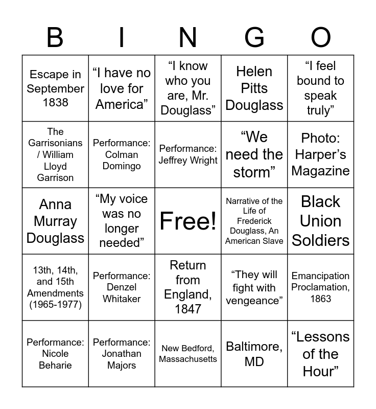 This bingo card has a free space and 24 words: Performance: Denzel Whitaker, Performance: Jonathan Majors, Performance: Jeffrey Wright, Performance: Nicole Beharie, “I feel bound to speak truly”, Escape in September 1838, The Garrisonians / William Lloyd Garrison, “I have no love for America”, Narrative of the Life of Frederick Douglass, An American Slave, Return from England, 1847, “We need the storm”, Anna Murray Douglass, “They will fight with vengeance”, Emancipation Proclamation, 1863, Performance: Colman Domingo, Baltimore, MD, Black Union Soldiers, “I know who you are, Mr. Douglass”, Photo: Harper’s Magazine, “My voice was no longer needed”, “Lessons of the Hour”, 13th, 14th, and 15th Amendments (1965-1977), Helen Pitts Douglass and New Bedford, Massachusetts.