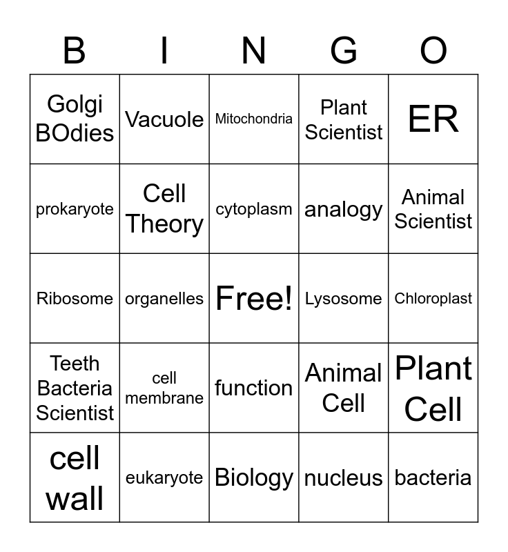 This bingo card has a free space and 24 words: cell wall, cell membrane, cytoplasm, nucleus, ER, Golgi BOdies, Vacuole, Mitochondria, Lysosome, Chloroplast, Ribosome, Cell Theory, Animal Cell, Plant Cell, prokaryote, eukaryote, Biology, Plant Scientist, Animal Scientist, Teeth Bacteria Scientist, organelles, function, analogy and bacteria.