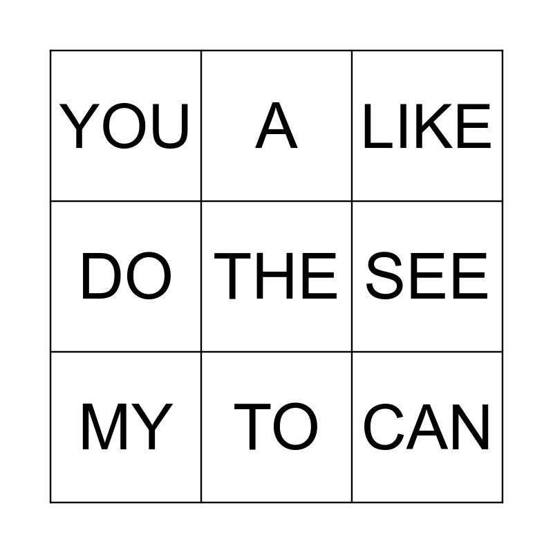 This bingo card has 12 words: I, CAN, THE, SEE, A, LIKE, TO, GO, YOU, DO, MY and AND.
