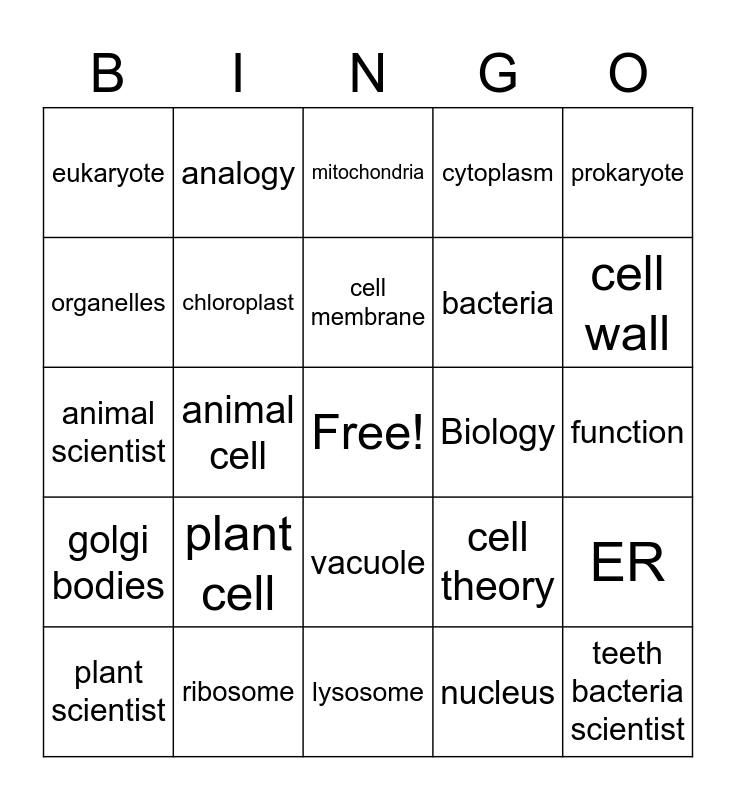 This bingo card has a free space and 24 words: plant scientist, plant cell, cell membrane, nucleus, prokaryote, eukaryote, analogy, mitochondria, Biology, function, animal scientist, chloroplast, cell theory, ER, organelles, ribosome, lysosome, cytoplasm, cell wall, golgi bodies, animal cell, vacuole, bacteria and teeth bacteria scientist.