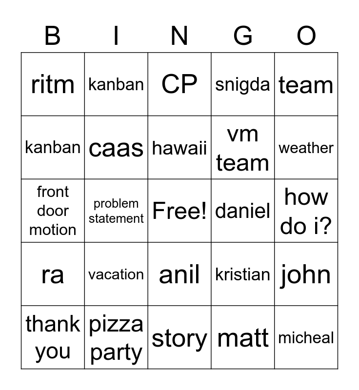 This bingo card has a free space and 48 words: practices, micheal, lead, story, vacation, debbie, kanban, debbie interrupts, kanban, own, caas, snigda, john, kristian, jira, family, hawaii, daniel, email, team, problem statement, matt, ritm, vm team, inc, weather, thank you, scripts, anil, ra, 7d, standards, dw, manager, pizza party, john, kristian, how do i?, lost internet, WFP, priortize, todo's, CP, garage door notification, front door motion, value adds, layers of complexity and work threads.