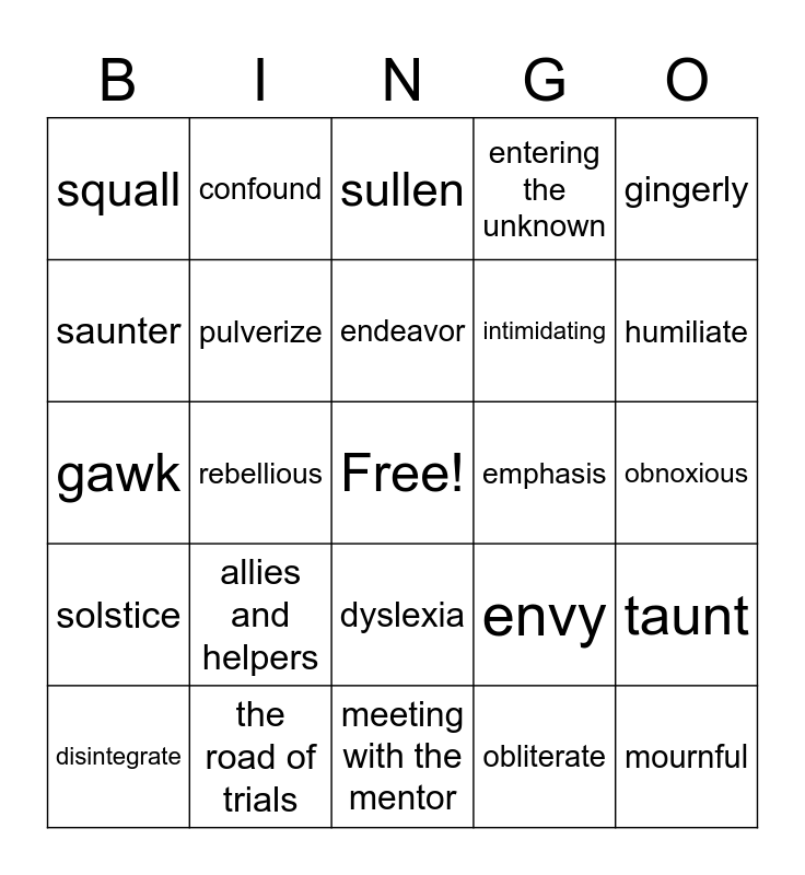 This bingo card has a free space and 24 words: allies and helpers, the road of trials, endeavor, disintegrate, gingerly, squall, saunter, confound, emphasis, dyslexia, intimidating, gawk, envy, taunt, pulverize, obliterate, obnoxious, sullen, humiliate, rebellious, mournful, solstice, entering the unknown and meeting with the mentor.