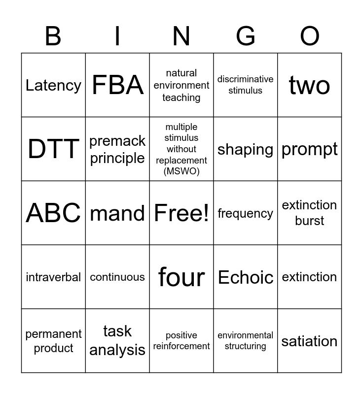This bingo card has a free space and 27 words: Echoic, Tact, shaping, positive reinforcement, DTT, natural environment teaching, FBA, intraverbal, frequency, extinction, ABC, discriminative stimulus, permanent product, task analysis, prompt, behavior, premack principle, multiple stimulus without replacement (MSWO), continuous, Latency, extinction burst, environmental structuring, mand, satiation, four, two and seven.