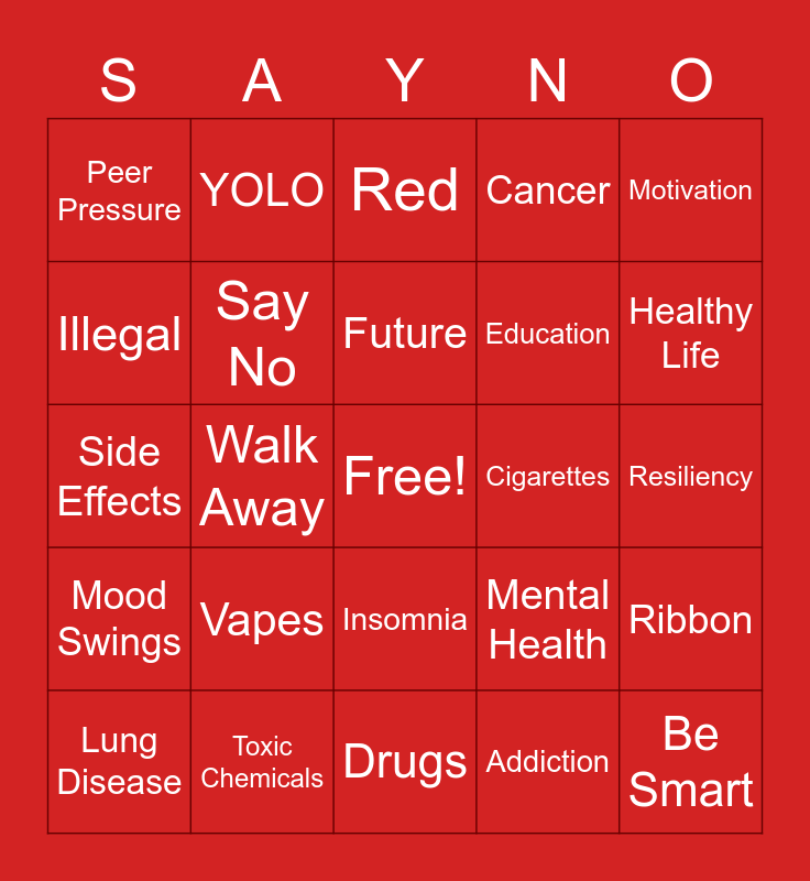This bingo card has a free space and 29 words: Lung Disease, Drug Free, Walk Away, Bad Habits, Peer Pressure, Red, Say No, Vapes, Cigarettes, Toxic Chemicals, Resiliency, Be Smart, Drugs, Addiction, Healthy Life, Death, Insomnia, Mood Swings, Motivation, Side Effects, Mental Health, Tell An Adult, Education, Illegal, Cancer, YOLO, Ribbon, Future and Stay Sober.