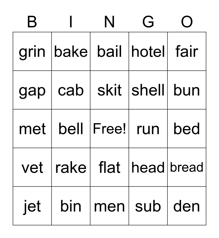 This bingo card has a free space and 44 words: back, den, club, jet, late, sub, bail, then, fair, bin, hotel, run, flat, rake, mail, men, snail, met, plate, bun, bake, bat, spare, grin, fall, bed, king, fan, head, vet, scan, bread, hit, tan, bell, sing, sand, well, skit, gap, shell, pit, cab and bin.