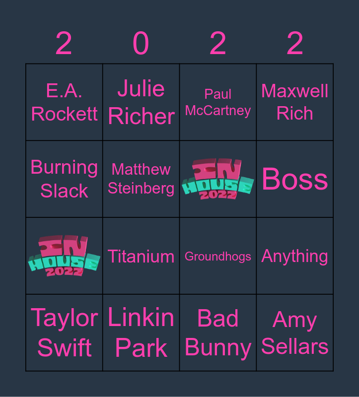 This bingo card has 2 images and 14 words: Linkin Park, Anything, Paul McCartney, E.A. Rockett, Julie Richer, Groundhogs, Bad Bunny, Burning Slack, Matthew Steinberg, Taylor Swift, Maxwell Rich, Titanium, Boss and Amy Sellars.