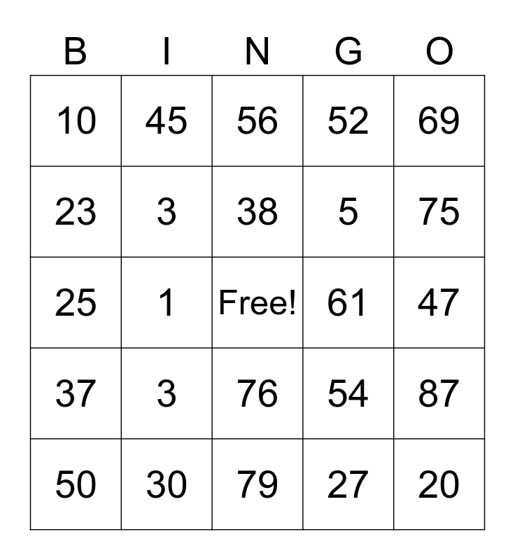This bingo card has a free space and 24 words: 3, 30, 38, 50, 69, 10, 23, 45, 61, 76, 5, 25, 54, 87, 3, 27, 47, 56, 75, 1, 20, 37, 52 and 79.