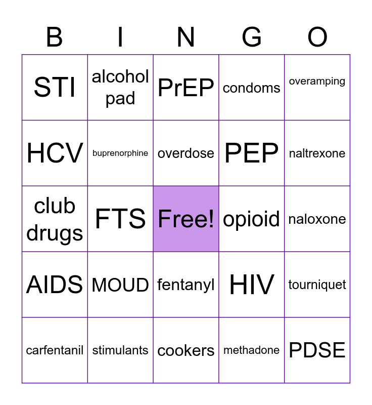 This bingo card has a free space and 24 words: MOUD, stimulants, overdose, carfentanil, overamping, STI, HCV, alcohol pad, opioid, fentanyl, PEP, club drugs, HIV, tourniquet, buprenorphine, methadone, naloxone, PrEP, naltrexone, FTS, PDSE, AIDS, condoms and cookers.