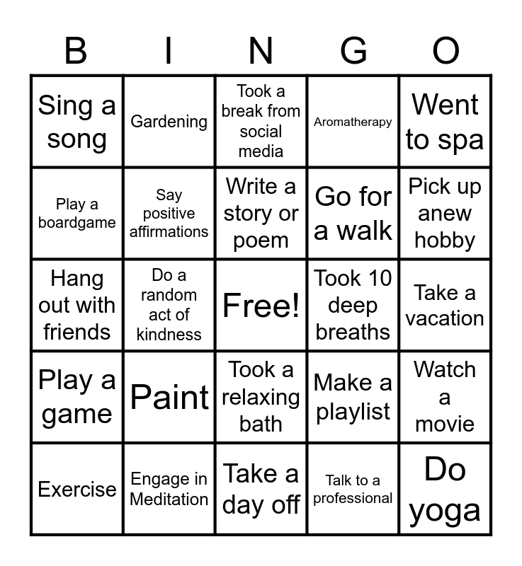 This bingo card has a free space and 29 words: Use a Stress Ball, Engage in Meditation, Took a break from social media, Talk to a friend, Went to spa, Sing a song, Say positive affirmations, Write a story or poem, Took 10 deep breaths, Watch a movie, Exercise, Do a random act of kindness, Talk to a professional, Do yoga, Hang out with friends, Eat healthy, Take a day off, Make a playlist, Pick up anew hobby, Play a game, Paint, Bond with your pet, Go for a walk, Take a vacation, Play a boardgame, Gardening, Took a relaxing bath, Aromatherapy and Clean your house.