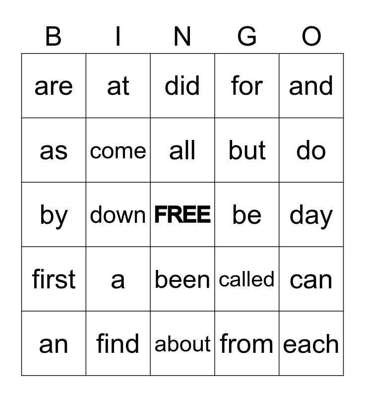 This bingo card has a free space and 25 words: a, about, all, an, and, are, as, at, be, been, but, by, called, can, come, could, day, did, do, down, each, find, first, for and from.