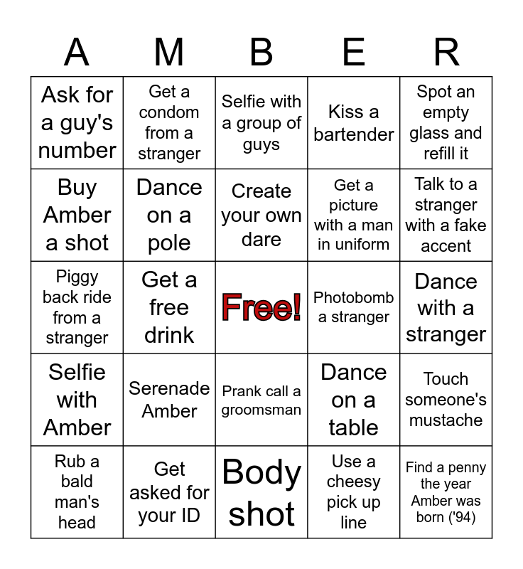 This bingo card has a free space and 29 words: Rub a bald man's head, Get someones business card, Get a free drink, Toast the bride, Ask for a guy's number, Selfie with a group of guys, Dance on a pole, Serenade Amber, Photobomb a stranger, Get asked for your ID, Dance with a stranger, Find a penny the year Amber was born ('94), Body shot, Use a cheesy pick up line, Talk to a stranger with a fake accent, Get Amber a lap dance, Prank call a groomsman, Selfie with Amber, Spot an empty glass and refill it, Piggy back ride from a stranger, Dance on a table, Use the men's bathroom, Get a picture with a man in uniform, Buy Amber a shot, Kiss a bartender, Get a condom from a stranger, Touch someone's mustache, Create your own dare and Tell a story about Amber.