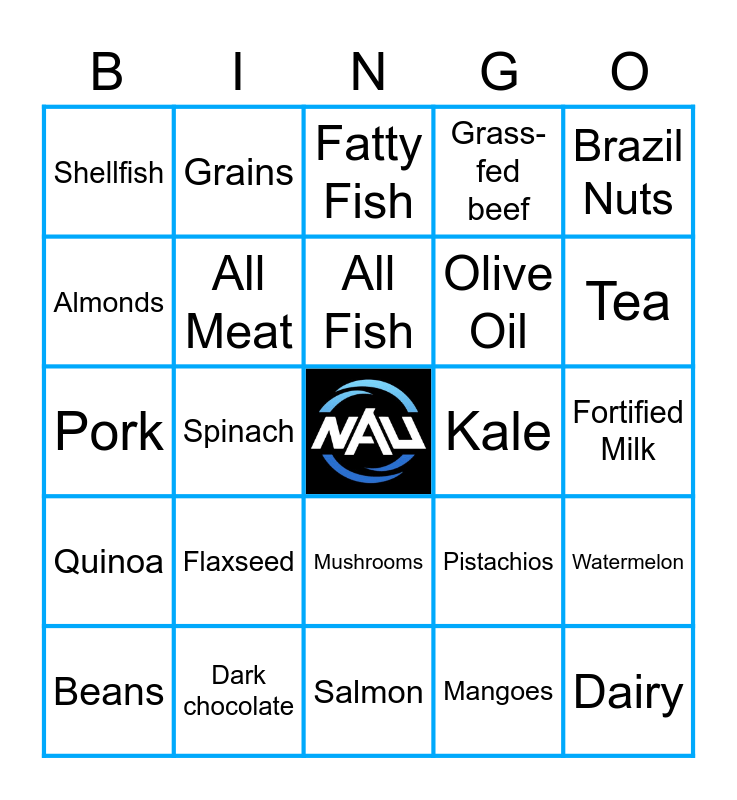 This bingo card has a free space and 44 words: Liver, Dairy, Oysters, Beans, Sardines, Mangoes, Fatty Fish, Hard Water, Brazil Nuts, Dark chocolate, Grass-fed beef, Kale, Mushrooms, Flaxseed, Turkey, Salmon, Chicken, Pork, Lamb, Tea, Grains, Beets, Pumpkin seeds, Shellfish, Natto, Fortified Milk, Kiwi, Eggs, Pistachios, Quinoa, Sweet Potato, Watermelon, Offal/Organs, Tofu, Spinach, Oranges, Avocados, Raisins, All Fish, Almonds, Olive Oil, Heart, All Meat and Herbs.