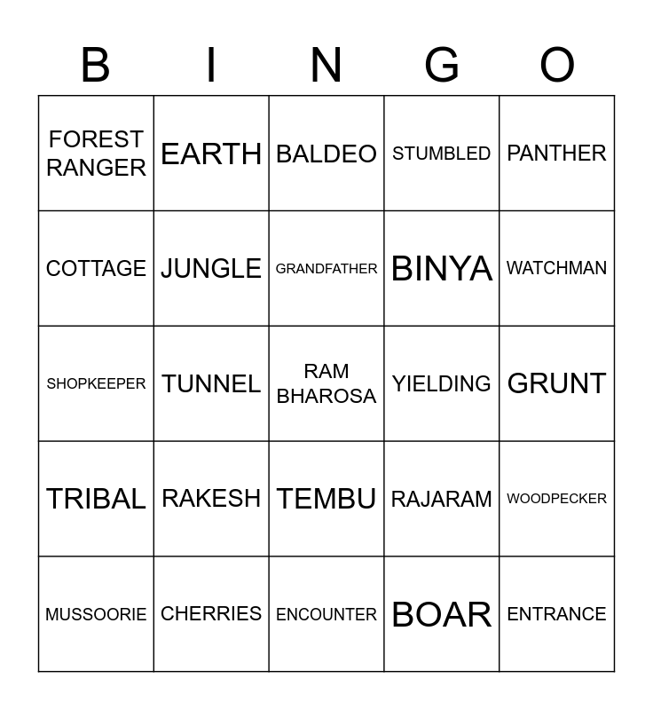This bingo card has a free space and 24 words: RAKESH, CHERRIES, GRANDFATHER, MUSSOORIE, PANTHER, FOREST RANGER, COTTAGE, EARTH, YIELDING, TEMBU, BINYA, SHOPKEEPER, RAJARAM, WOODPECKER, JUNGLE, BOAR, GRUNT, BALDEO, WATCHMAN, TUNNEL, ENTRANCE, TRIBAL, STUMBLED and ENCOUNTER.