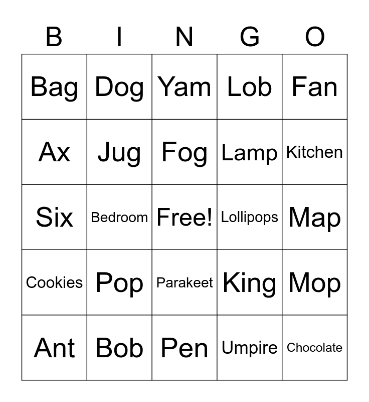This bingo card has a free space and 29 words: Ant, Goldfish, Bedroom, Gum, Bag, Yam, Jug, Pop, Lollipops, Bob, Map, Chocolate, Pen, Umpire, Kitchen, Caramels, Parakeet, Cookies, Fan, Six, King, Turtle, Lamp, Ax, Lob, Dog, Mop, Fog and Lap.