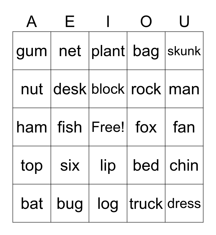 This bingo card has a free space and 29 words: bat, bell, fish, clock, gum, plant, desk, six, fox, bug, fan, dress, log, truck, man, sled, lip, top, skunk, ham, bed, chick, rock, nut, bag, net, chin, block and rug.