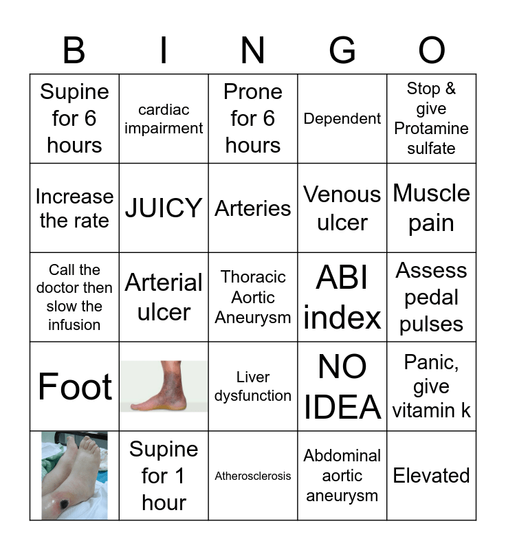 This bingo card has 5 images, a free space and 34 words: Bruit, JUICY, Liver dysfunction, Arteries, Stop & give Protamine sulfate, Foot, Arterial ulcer, Dependent, Elevated, Assess pedal pulses, ABI index, Intermittent Claudication, Supine for 6 hours, Pulmonary embolus, NO IDEA, Increase the rate, Atherosclerosis, Venous ulcer, Muscle pain, Supine, Prone, Veins, Arteriosclerosis, Auscultate for murmur, cardiac impairment, Duplex ultrasonagrapy, Stomach pain, Prone for 6 hours, Supine for 1 hour, Abdominal aortic aneurysm, Bleeding, Panic, give vitamin k, Call the doctor then slow the infusion and Draw an aPTT.