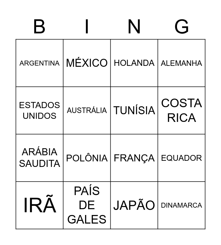 This bingo card has 20 words: EQUADOR, SENEGAL, HOLANDA, INGLATERRA, IRÃ, ESTADOS UNIDOS, PAÍS DE GALES, ARGENTINA, ARÁBIA SAUDITA, MÉXICO, POLÔNIA, FRANÇA, AUSTRÁLIA, DINAMARCA, TUNÍSIA, ESPANHA, COSTA RICA, ALEMANHA, JAPÃO and BÉLGICA.