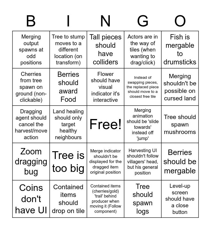 This bingo card has a free space and 24 words: Tree is too big, Contained items should drop on tile, Flower should have visual indicator it's interactive, Coins don't have UI, Fish is mergable to drumsticks, Merging output spawns at odd positions, Cherries from tree spawn on ground (non-clickable), Tree to stump moves to a different location (on transform), Merging animation should be 'slide towards' instead off 'jump', Merge indicator shouldn't be displayed for the dragged item original position, Instead of swapping pieces, the replaced piece should move to a closest free tile, Dragging agent should cancel the harvest/move action, Harvesting UI shouldn't follow villagers' head, but his general position, Berries should be mergable, Berries should award Food, Tree should spawn logs, Tree should spawn mushrooms, Tall pieces should have colliders, Merging shouldn't be possible on cursed land, Land healing should only target healthy neighbours, Level-up screen should have a close button, Zoom dragging bug, Actors are in the way of tiles (when wanting to drag/click) and Contained items (cherries/gold) 'trail' behind producer when moving it (Follow component).