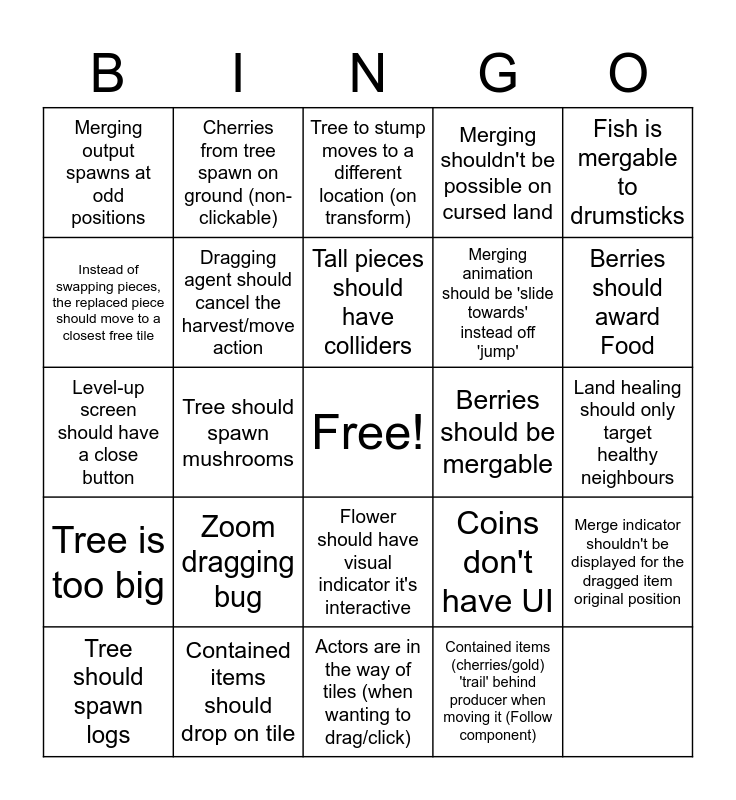 This bingo card has a free space and 24 words: Tree is too big, Contained items should drop on tile, Flower should have visual indicator it's interactive, Coins don't have UI, Fish is mergable to drumsticks, Merging output spawns at odd positions, Cherries from tree spawn on ground (non-clickable), Tree to stump moves to a different location (on transform), Merging animation should be 'slide towards' instead off 'jump', Merge indicator shouldn't be displayed for the dragged item original position, Instead of swapping pieces, the replaced piece should move to a closest free tile, Dragging agent should cancel the harvest/move action, Harvesting UI shouldn't follow villagers' head, but his general position, Berries should be mergable, Berries should award Food, Tree should spawn logs, Tree should spawn mushrooms, Tall pieces should have colliders, Merging shouldn't be possible on cursed land, Land healing should only target healthy neighbours, Level-up screen should have a close button, Zoom dragging bug, Actors are in the way of tiles (when wanting to drag/click) and Contained items (cherries/gold) 'trail' behind producer when moving it (Follow component).