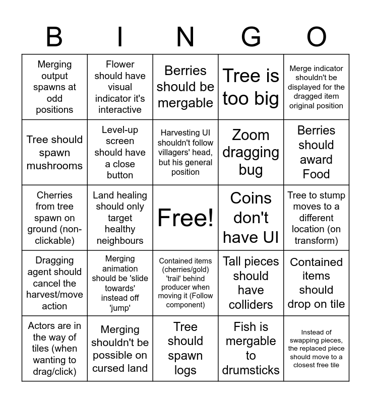 This bingo card has a free space and 24 words: Merging animation should be 'slide towards' instead off 'jump', Merging shouldn't be possible on cursed land, Harvesting UI shouldn't follow villagers' head, but his general position, Actors are in the way of tiles (when wanting to drag/click), Merge indicator shouldn't be displayed for the dragged item original position, Merging output spawns at odd positions, Tree should spawn mushrooms, Flower should have visual indicator it's interactive, Coins don't have UI, Contained items (cherries/gold) 'trail' behind producer when moving it (Follow component), Zoom dragging bug, Cherries from tree spawn on ground (non-clickable), Tall pieces should have colliders, Contained items should drop on tile, Level-up screen should have a close button, Fish is mergable to drumsticks, Tree to stump moves to a different location (on transform), Berries should be mergable, Berries should award Food, Land healing should only target healthy neighbours, Instead of swapping pieces, the replaced piece should move to a closest free tile, Dragging agent should cancel the harvest/move action, Tree is too big and Tree should spawn logs.