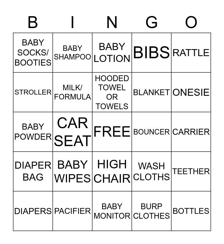 This bingo card has a free space and 24 words: BABY WIPES, PACIFIER, HOODED TOWEL OR TOWELS, DIAPERS, RATTLE, BABY SOCKS/ BOOTIES, STROLLER, BABY SHAMPOO, BOUNCER, HIGH CHAIR, BLANKET, BABY POWDER, WASH CLOTHS, TEETHER, MILK/ FORMULA, BURP CLOTHES, CARRIER, BABY LOTION, ONESIE, CAR SEAT, BOTTLES, DIAPER BAG, BIBS and BABY MONITOR.